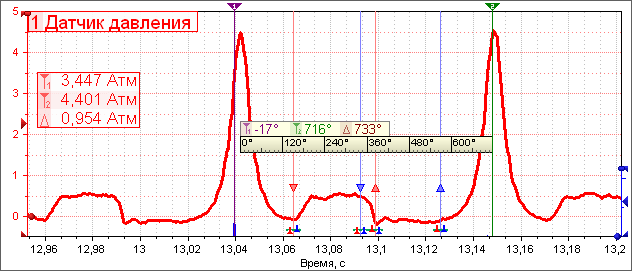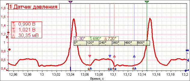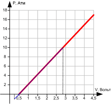 Диалог настройкиДля открытия диалога настройки необходимо щелкнуть по стрелке в нижнем правом углу кнопки выбора настройки, после чего в появившемся всплывающем меню щелкнуть по пункту меню 'Настройка'.Для того, что бы не было тавтологии - настройка настройки АК, в диалоге настройки используется термин датчик, под которым и подразумевается настройка АК. ![]() Датчики могут, объединяются в логически связанные группы (категории датчиков), например датчики, используемые при диагностики первичной или вторичной цепи зажигания, датчики давления, датчики общего назначения и т.д. В диалоге настройки категории аналогичны папкам, а датчики аналогичны файлам с данными. Категория и датчик должны иметь название, при необходимости краткое описание (отображающиеся в виде подсказки для кнопки настройки и соответствующего пункта меню) а также не большую пиктограмму для более удобного поиска категории / датчика в списке. Кроме того, датчик позволяет задать размерность измеряемой физической величины, например Па, Бар, Вольт, и выбрать десятичную приставку для более удобно отображения значений, т.е. отображать, например 100 - 1700 КПа, вместо 100 000 - 17 000 000 Па. На данный момент датчики поддерживаются два типа преобразования: ограничение и линейное преобразование. Ограничение предназначено только для ограничения границ входного диапазона АК выбираемых соответствующей рукояткой. Ограничение удобно использовать в тех случаях, когда максимальное значение напряжения на выходе датчика находится в заранее известных пределах значительно меньших максимально допустимых ± 1000 Вольт для аналогового канала. Например, при диагностике датчика кислорода, выходное напряжение которого будет в пределах 0…5 Вольт, возможно, ограничить входной диапазон, например -1…6 Вольт, что не позволит по ошибке выбрать достаточно большой входной диапазон (более грубый), а также обеспечит большее количество дискретных значений задания входного диапазона. Линейное преобразование кроме ограничения позволяет задать соответствие между измеряемыми значениями напряжения и реальными значениями измеряемой физической величины. Для задания соответствия достаточно всего лишь задать требуемые границы измеряемой физической величины, и на основании технических данных об используемом датчике, задать соответствующие им значения измеряемого напряжения. Проиллюстрируем выше описанное задание соответствия на основании датчика давления фирмы Honeywell MLH250PSB01A. На основании технических данных о датчике определяем: Минимальное выходное напряжение: 0,5 Вольт Максимальное выходное напряжение: 4,5 Вольт Чувствительность датчика: 0,235 Вольт / Атм Зависимость выходного напряжения от давления можно представить в следующем виде (графическое отображение представлено для удобного осуществления обратного преобразования, т.е. Вольт в Атм). ![]() Так как при измерении давления в цилиндре на 1000 – 1200 об. / мин. используется не вся шкала датчика, то ограничим ее сверху 10 Атм, а с учетом того что в цилиндре будет небольшое разряжение продолжим шкалу снизу до -1 Атм. На основании графика рассчитаем значения напряжений на выходе датчика давления соответствующие выбранным границам измеряемой физической величины: Выходное напряжение соответствующие -1 Атм: 0,265 Вольт Выходное напряжение соответствующие 10 Атм: 2,